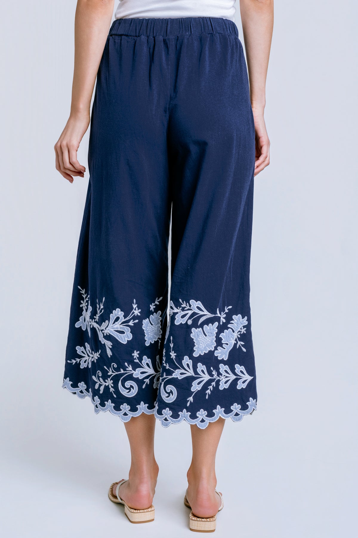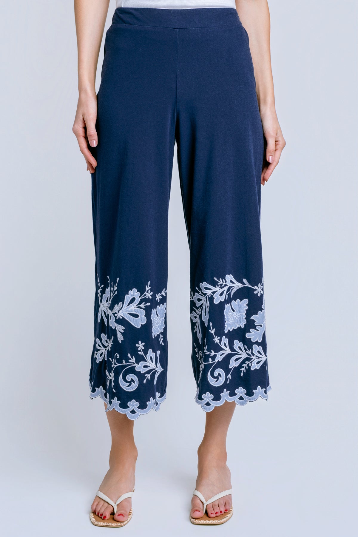 Crafted from breathable 100% cotton, the Knit Addeline Culotte Pants are equal parts comfort and elevated style. Featuring an elastic waist and wide legs, these cropped culottes are finished with an intricately embroidered border at the hemline. Pair with a silk cami and layer with the Addeline Jersey Kimono for a resort-worthy polished look.