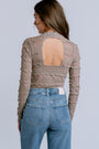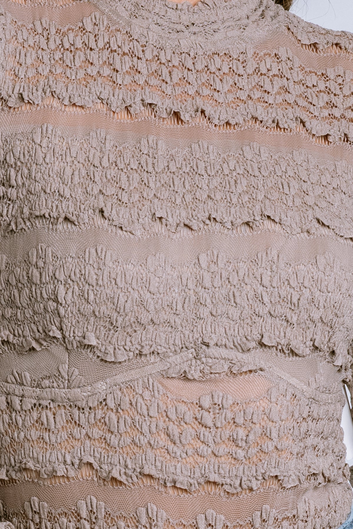 Have a lacey moment with this sheer bodysuit, featured in a long sleeve style with a mock neckline and cutout back detail. Thong bottom with snap gusset.