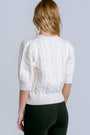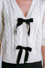 A cable knit, short sleeve sweater with contract velvet bow tie details at the front.