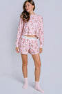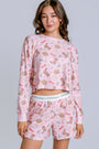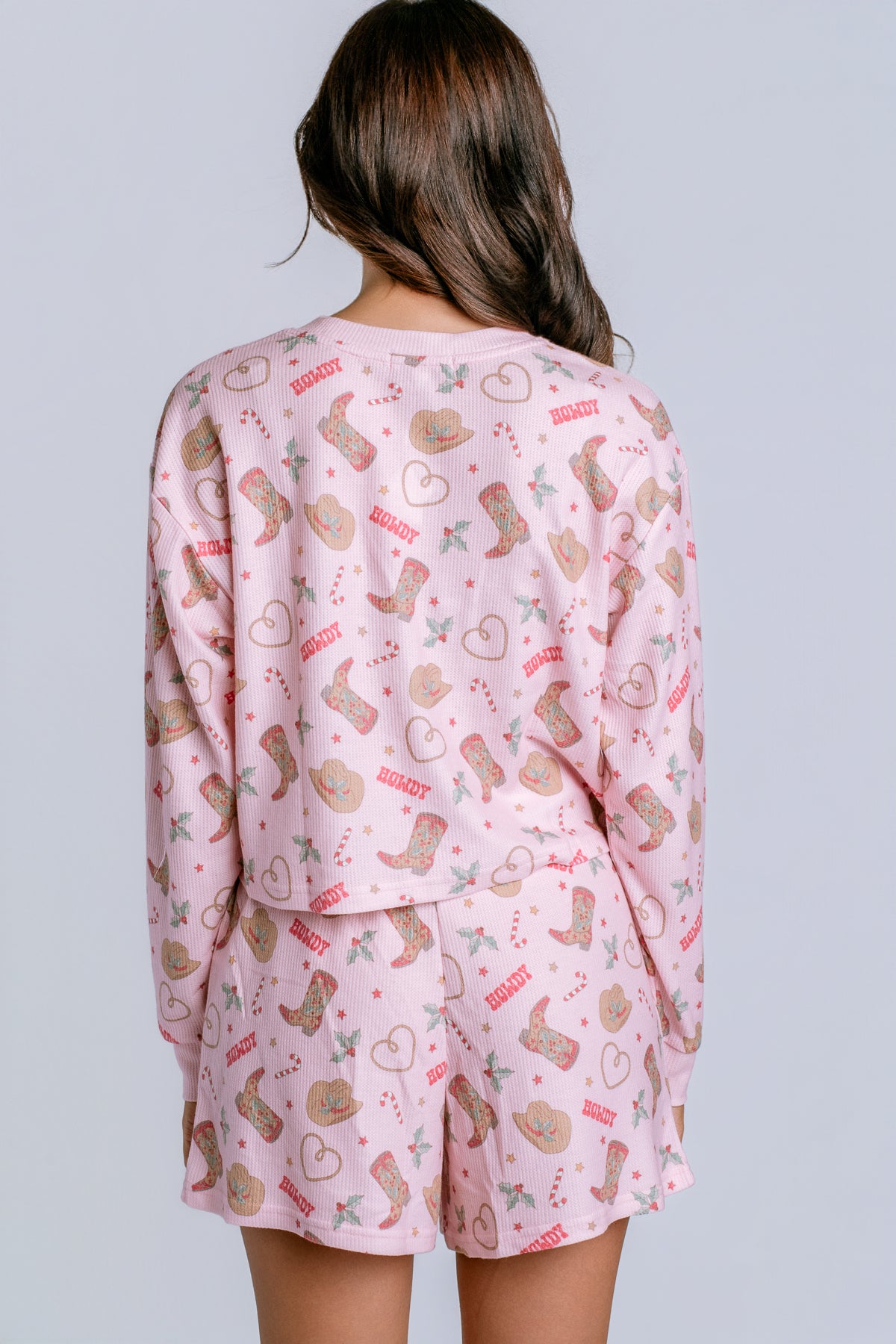 Kick back with a playful western twist in this pink two-piece pajama set. Crafted from baby peachy waffle, it features cowboy hats, boots, and stars across a long-sleeve top and boxer shorts—holiday lounging with a western spirit.