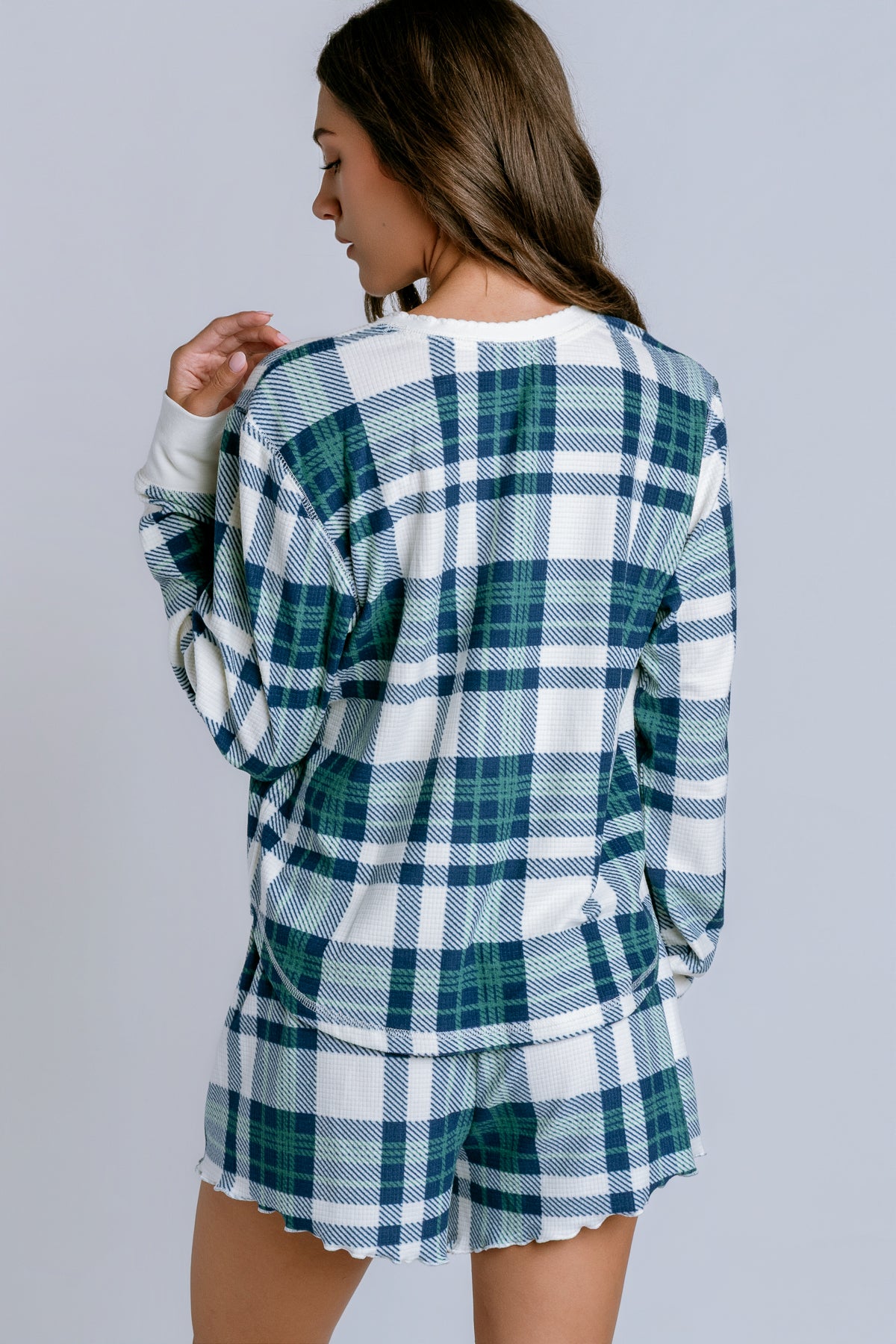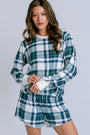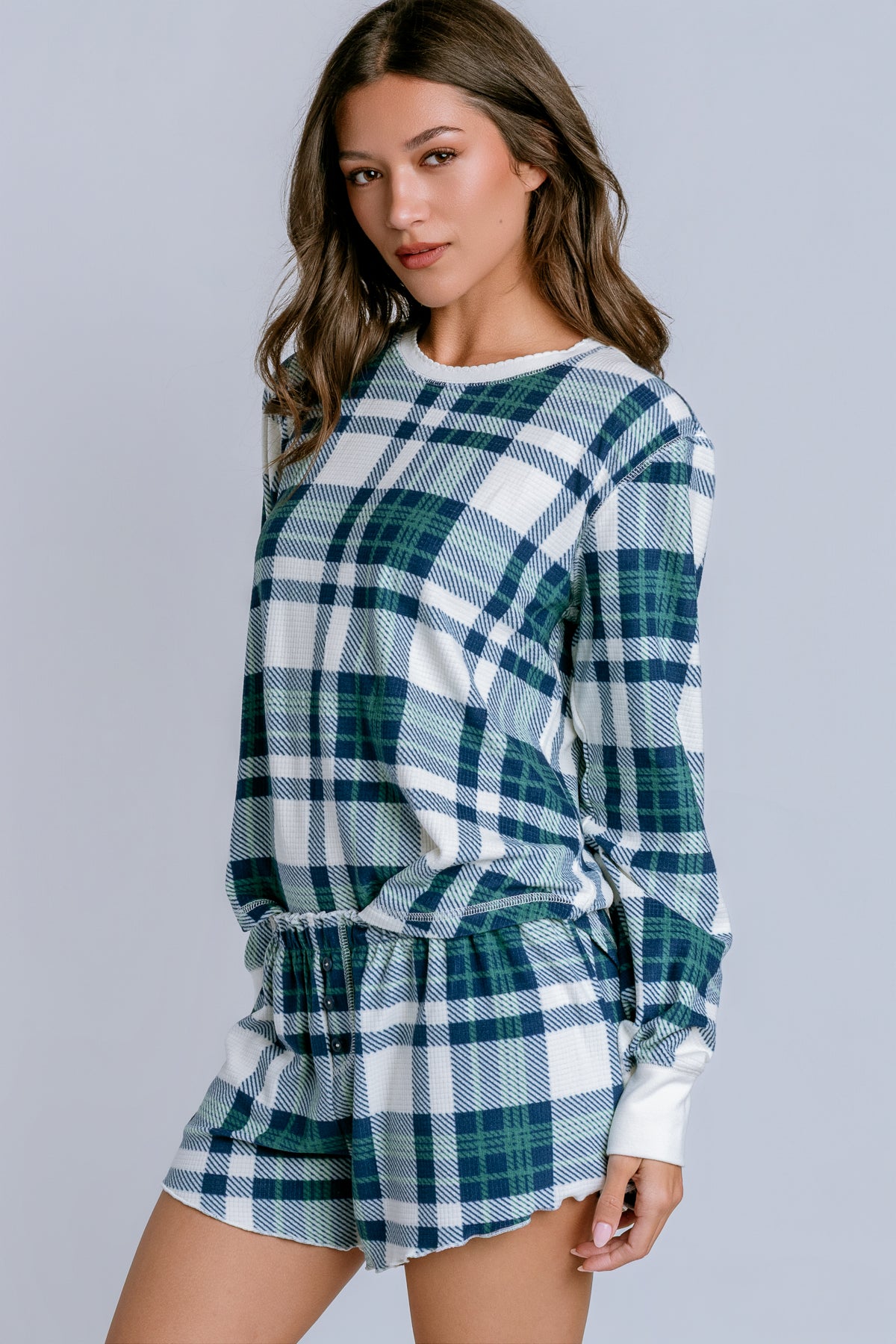 Mad for plaid? Us too. This dreamy two-piece is crafted from cloud-soft thermal velour in classic blue-and-green checks on an ivory backdrop. With its relaxed crew top and drawstring pants finished in cuffed hems, it’s the kind of set made for crisp mornings, movie marathons, and curling up with something warm in hand.