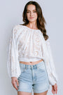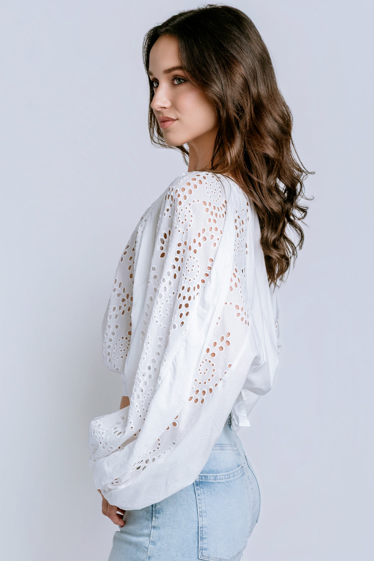 Meet your new go-to boho essential. The Florentina Top showcases intricate allover eyelet work that feels both feminine and laid-back. Generous blouson sleeves drape beautifully, while the tie back hem gives you styling flexibility. A subtle back slit keeps things comfortable and breezy.