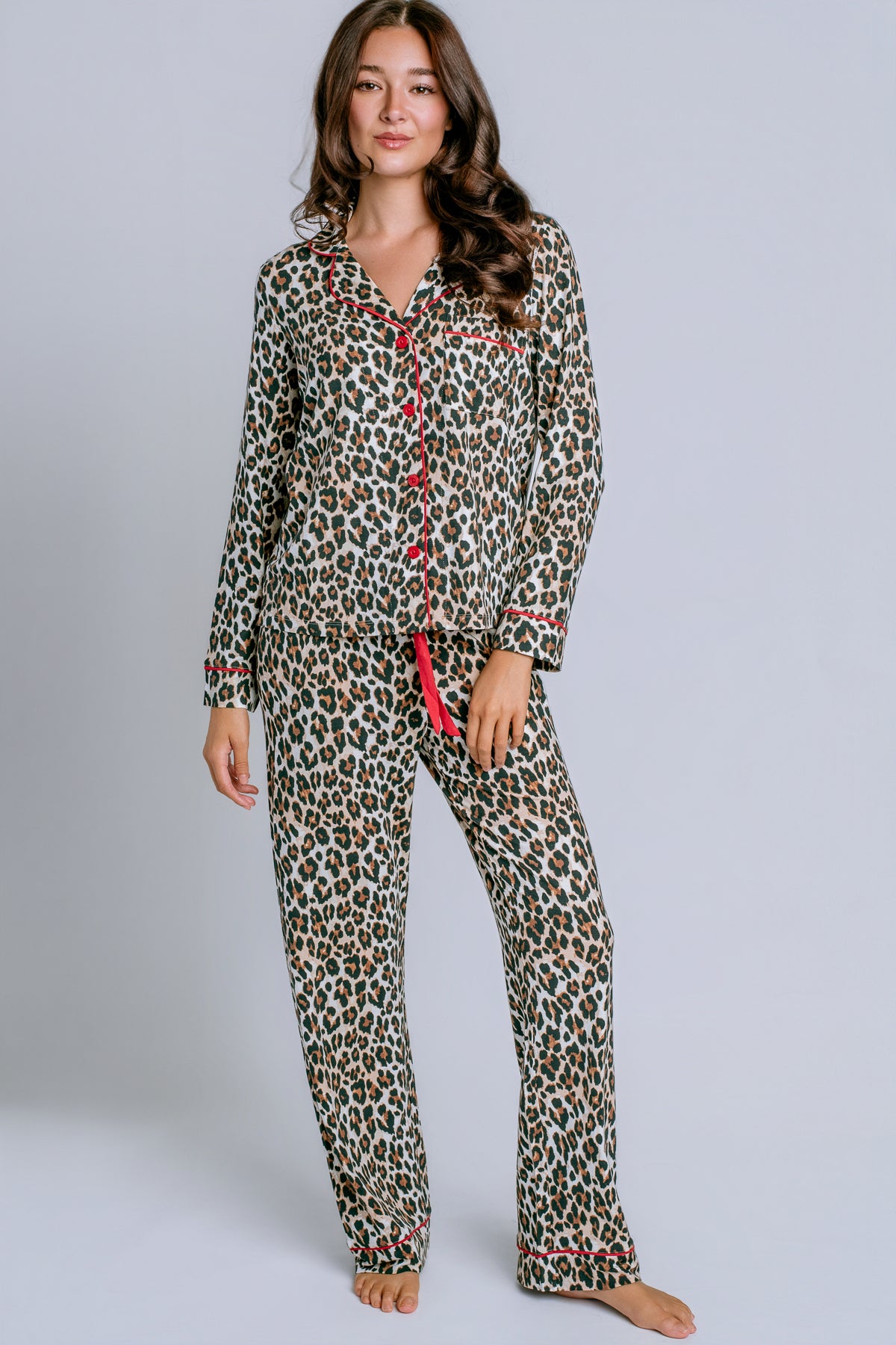 Unwind on the wild side in this modal jersey pajama shirt, patterned all over in leopard spots. The button-down top is finished with red piping and buttons—an easy way to add a fierce twist to cozy nights in.