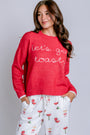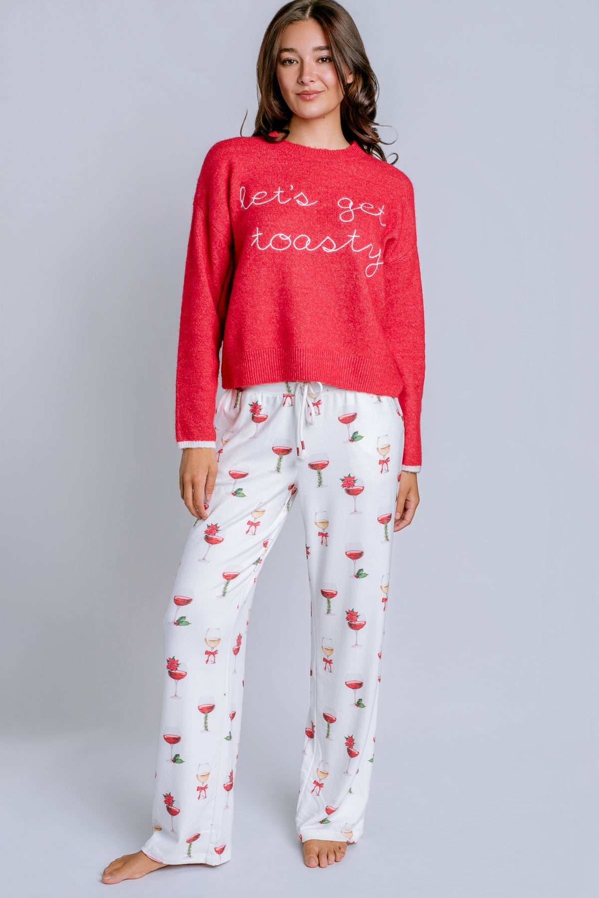 Snuggle-worthy in festive red, this sweater knit top is stamped with a bold “let’s get toasty” graphic across the chest. Designed with a crew neckline, ribbed trim, and ivory cuff accents, it’s a playful layer for pairing with plaid pants, joggers, or denim.