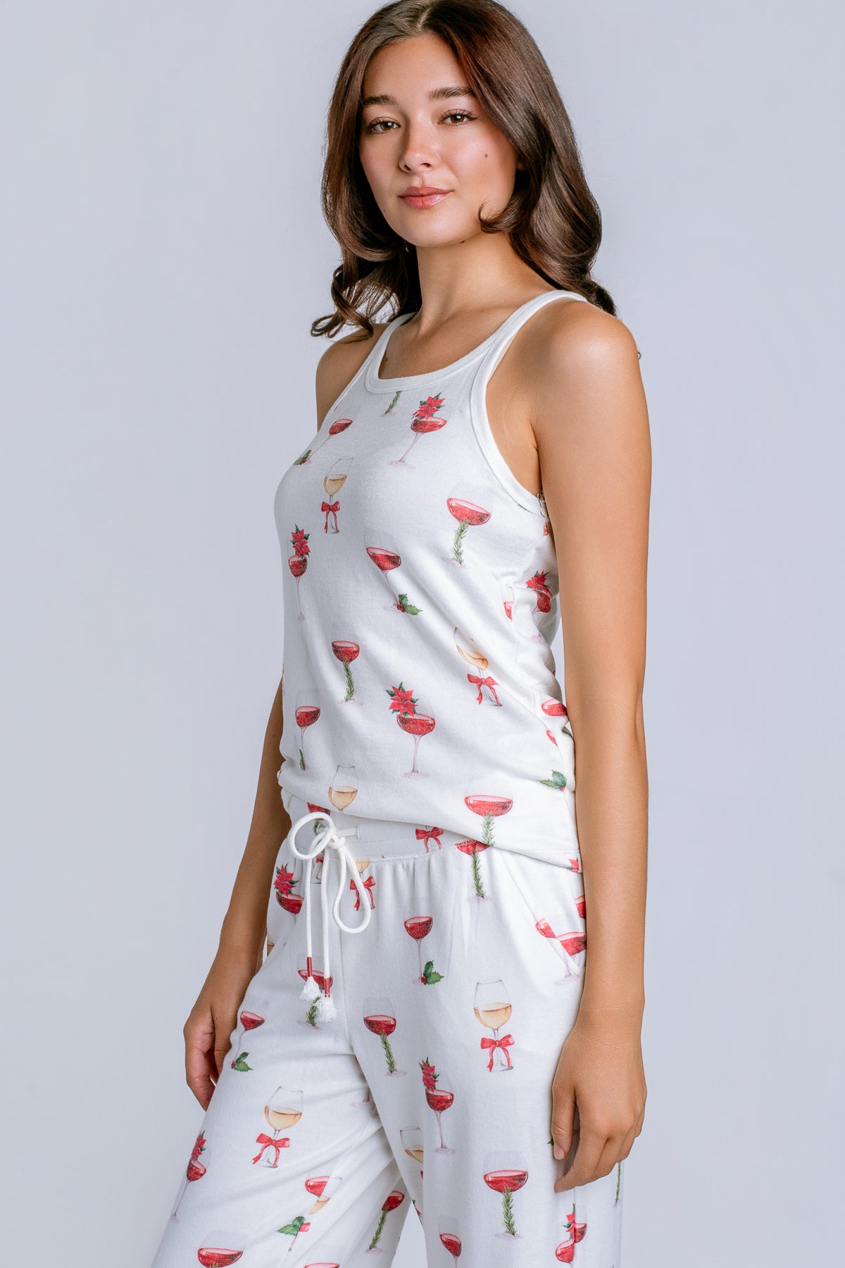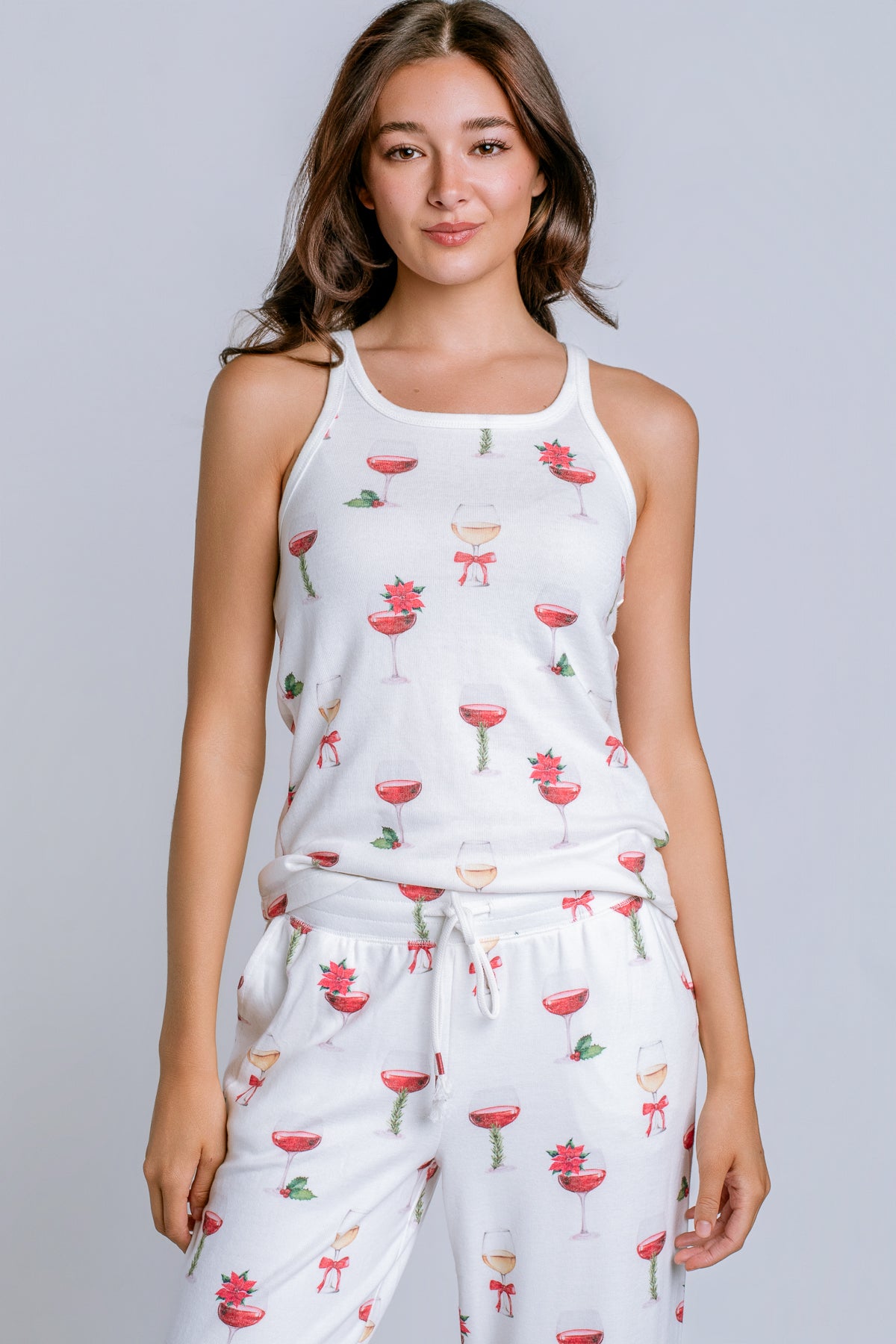 Raise a toast to cozy season in this ivory racerback tank, scattered with festive champagne glasses. Cut in our peachy jersey, it has a scoop neckline, curved hem, and sporty straps that make it just as good for layering under the matching flannels as it is for mixing with joggers or shorts.