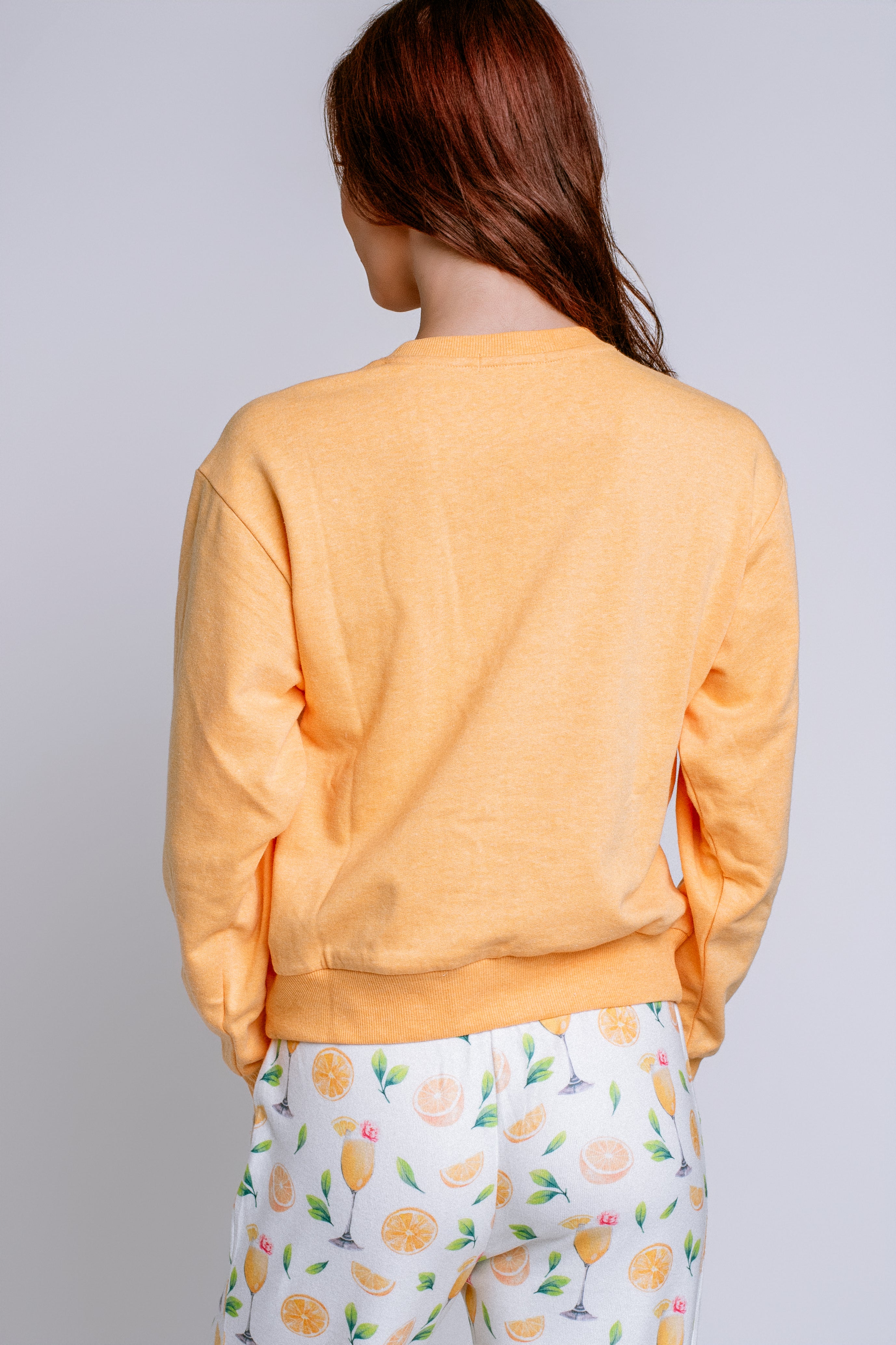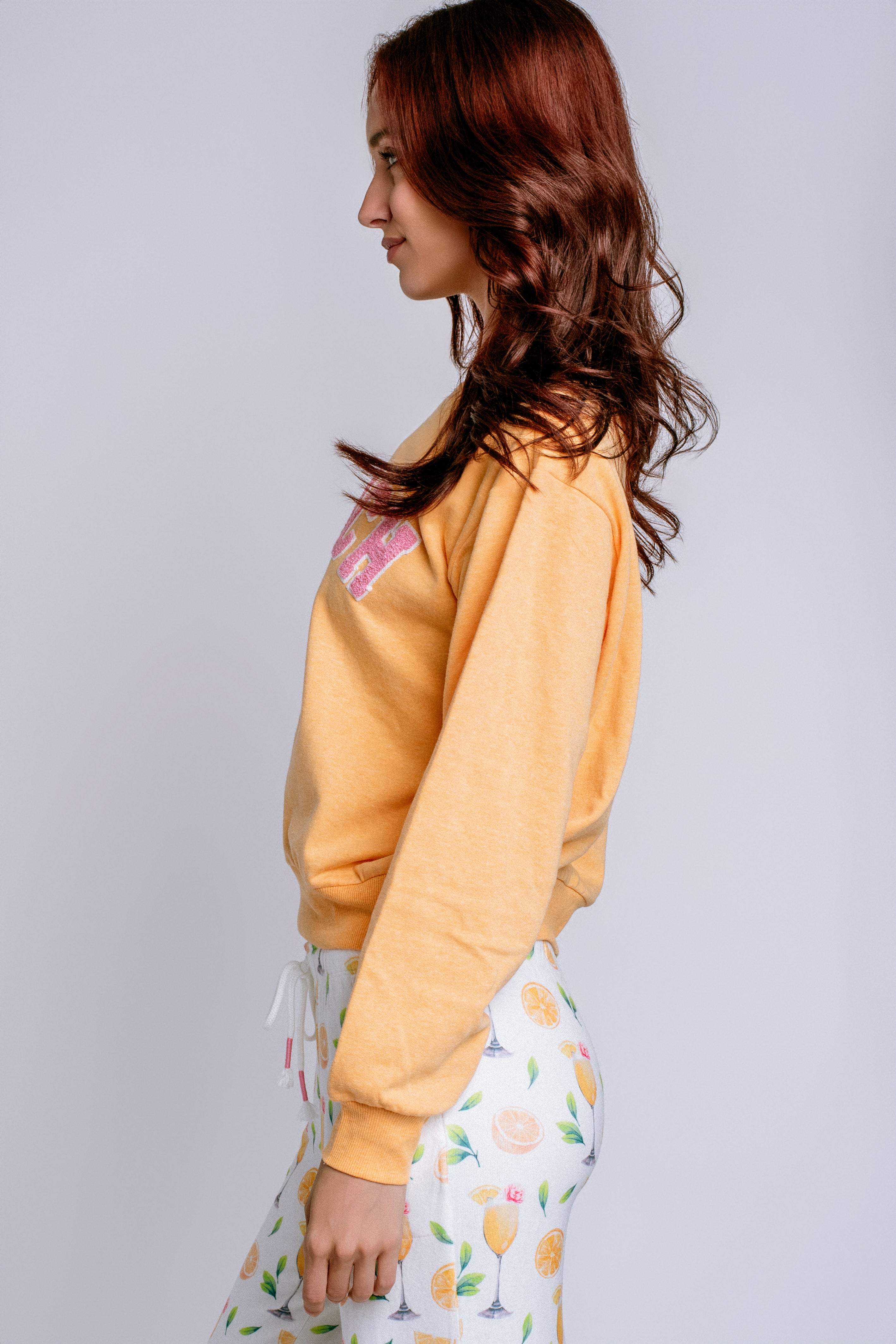 Cheers to rolling out of bed and straight to brunch. Made from soft French terry in a sunwashed orange with fuzzy pink chenille lettering, this sweatshirt brings the weekend vibes loud and clear. The relaxed fit, classic crewneck, and ribbed trim seal the cozy deal.