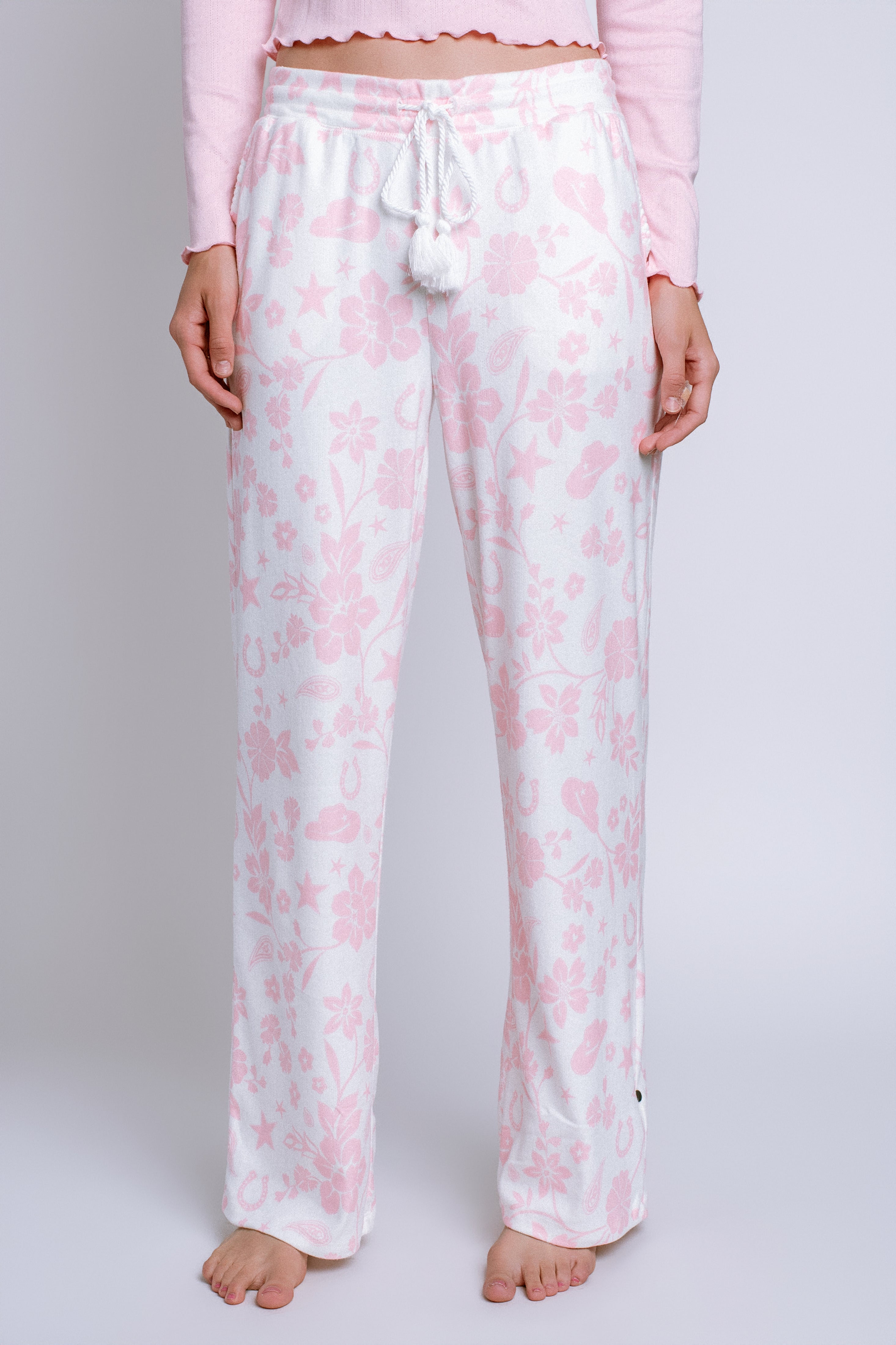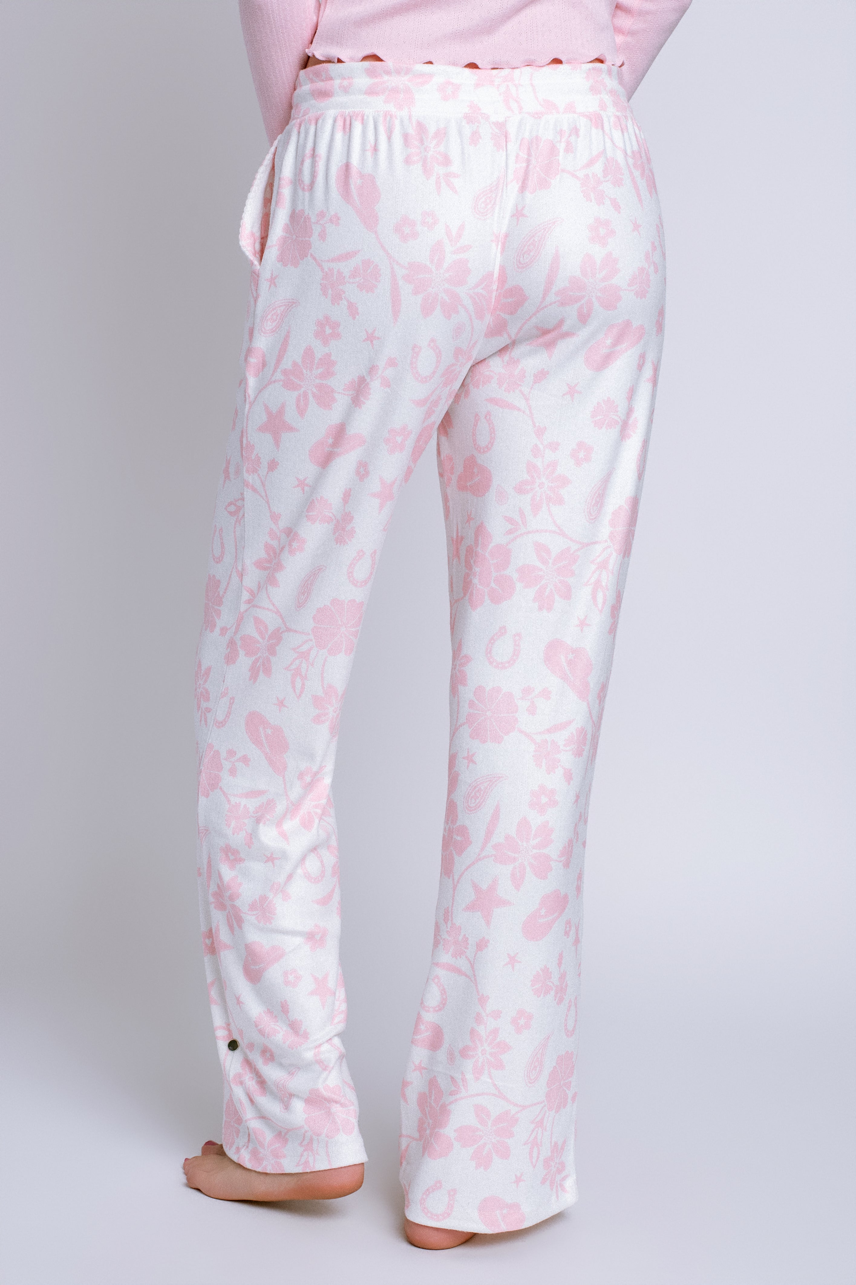 The coziest drawstring lounge pants made from ultra-soft pointelle in a pink and white western print.