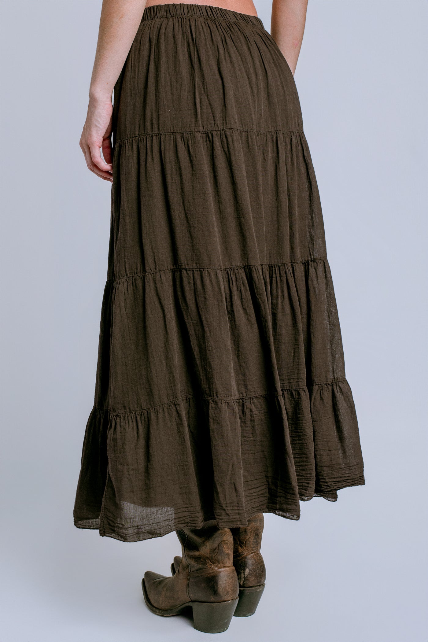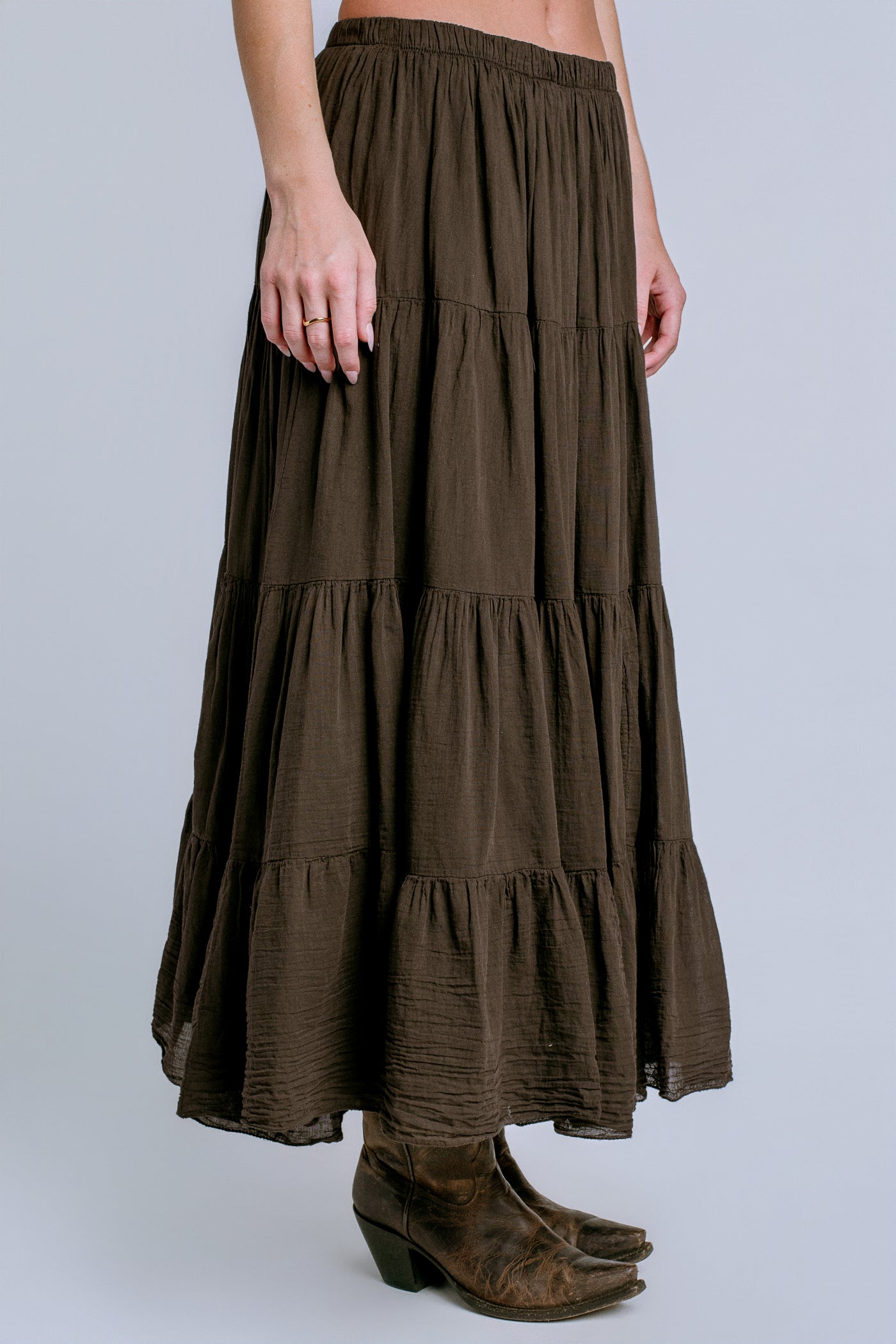 A tiered cotton midi skirt with elasticized waist and swingy silhouette.