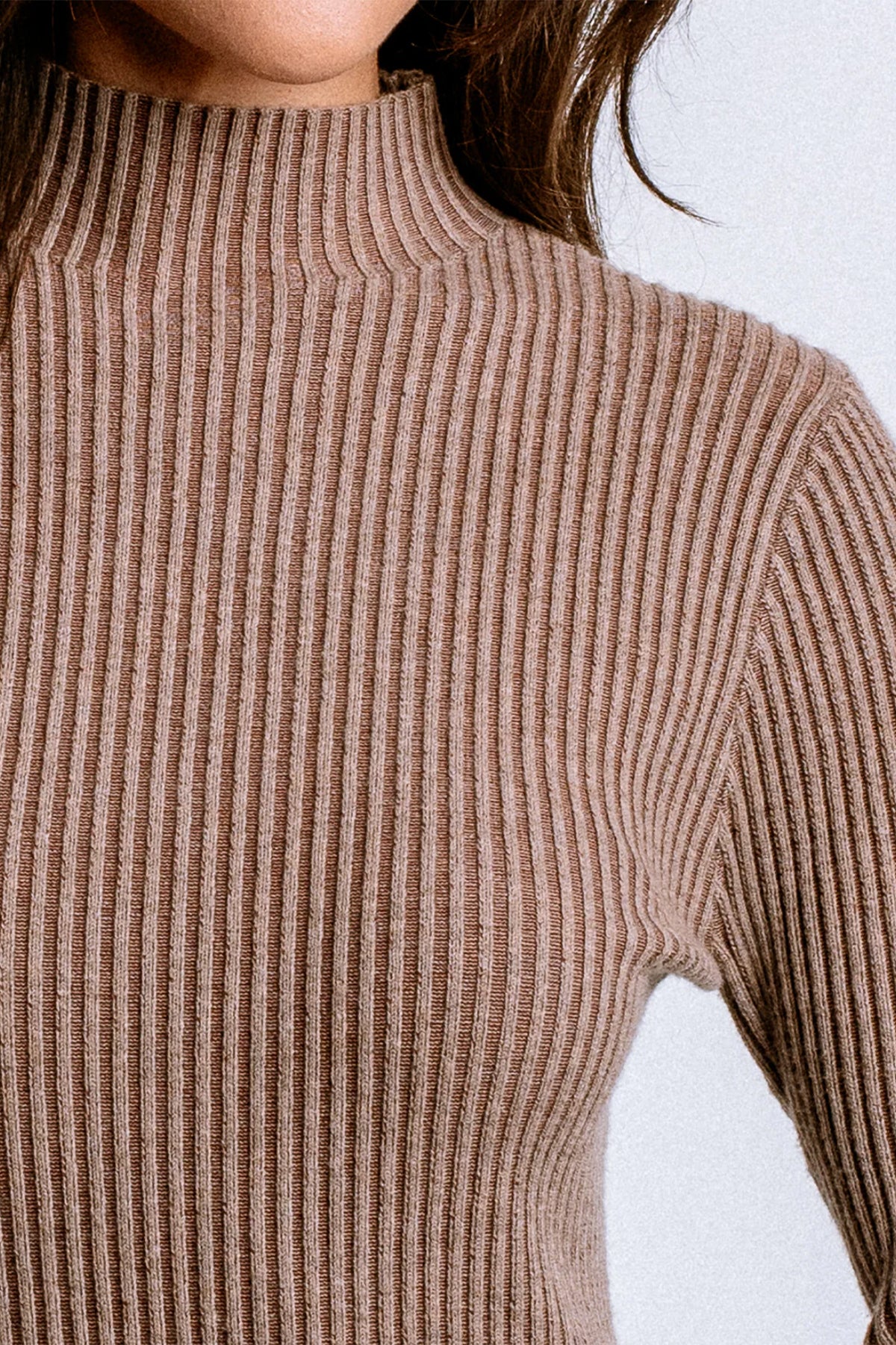 A fitted mock neck top with long sleeve in two-tone rib pattern with center front wide rib accent.