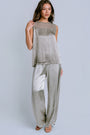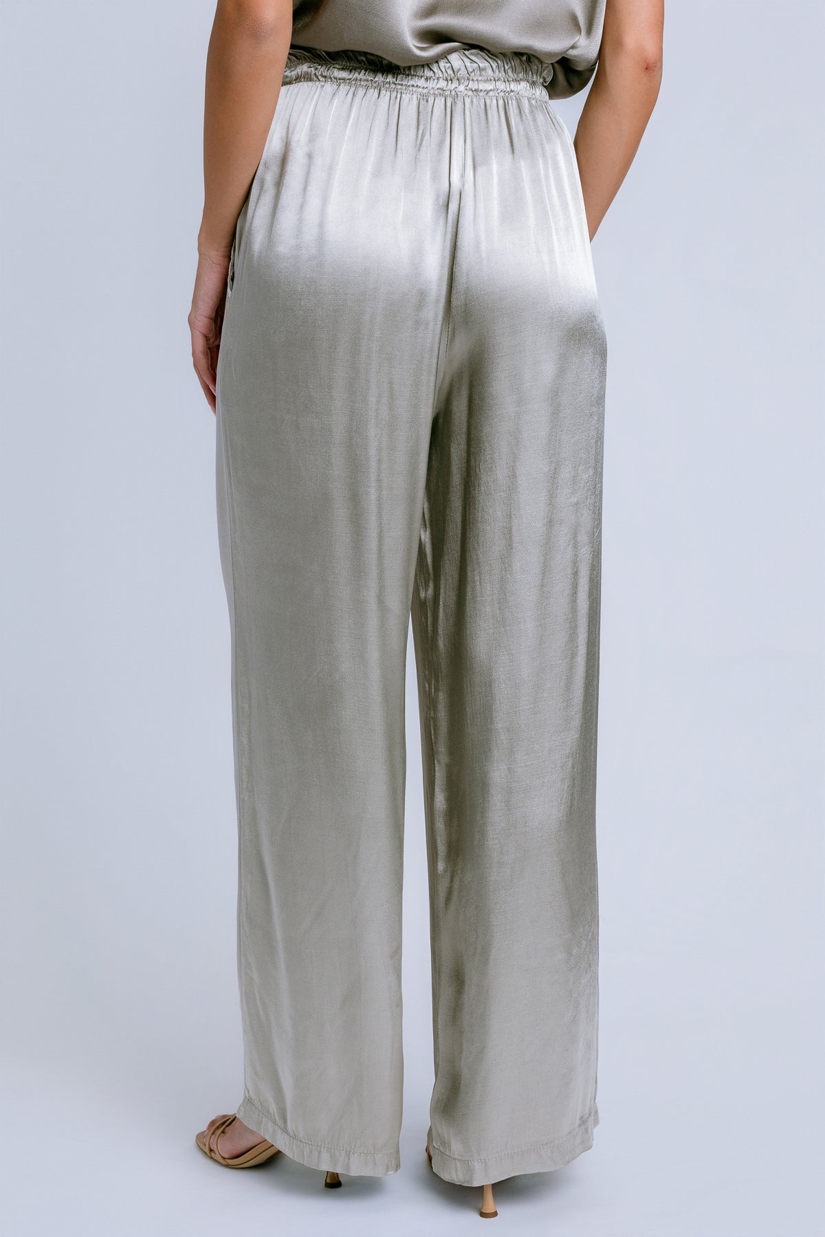 Embrace effortless elegance with these wide leg palazzo pants in luxurious satin. The adjustable drawstring waist ensures a custom fit while the flowing palazzo silhouette creates an elongated, graceful line. Pair with the matching top for the perfect Holiday look.